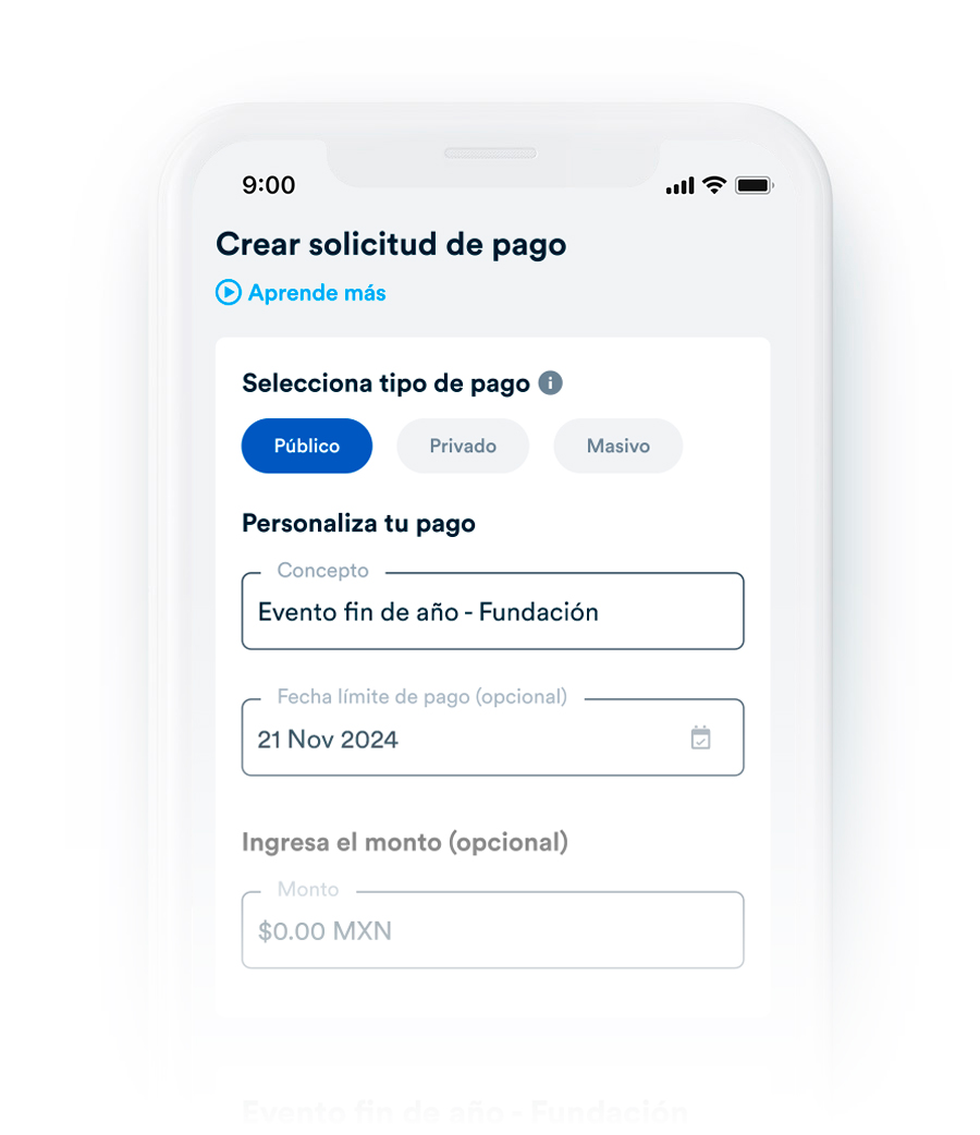 Crea y comparte el mismo link para cobrar. El monto lo decide la persona que recibe la solicitud, es ideal para escenarios de colectas y donativos.