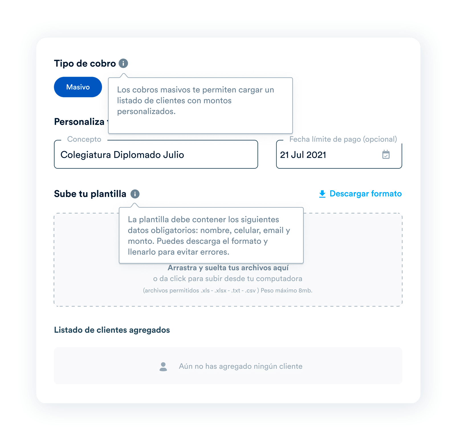 Sube un listado de clientes. Los montos y motivos de cobro pueden personalizarse de acuerdo a tus necesidades.